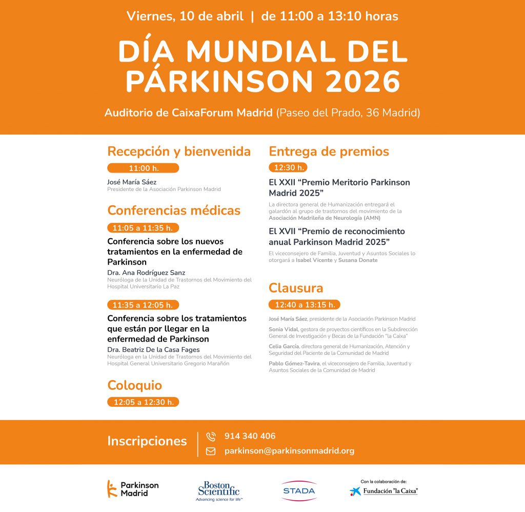 La Asociación Parkinson Madrid, miembro de FEMADEN, organiza el próximo viernes 10 de abril una jornada especial con motivo del Día Mundial del Párkinson 2026 en el Auditorio CaixaForum Madrid (Paseo del Prado, 36).