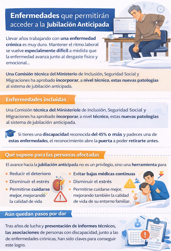 En este contexto, se ha conocido recientemente un avance importante: la Comisión Técnica del Ministerio de Inclusión, Seguridad Social y Migraciones ha aprobado, a nivel técnico, la incorporación de siete nuevas enfermedades al sistema de jubilación anticipada. Aunque el proceso aún no está cerrado, supone un paso relevante para muchas personas que hasta ahora no veían reconocida su realidad laboral.